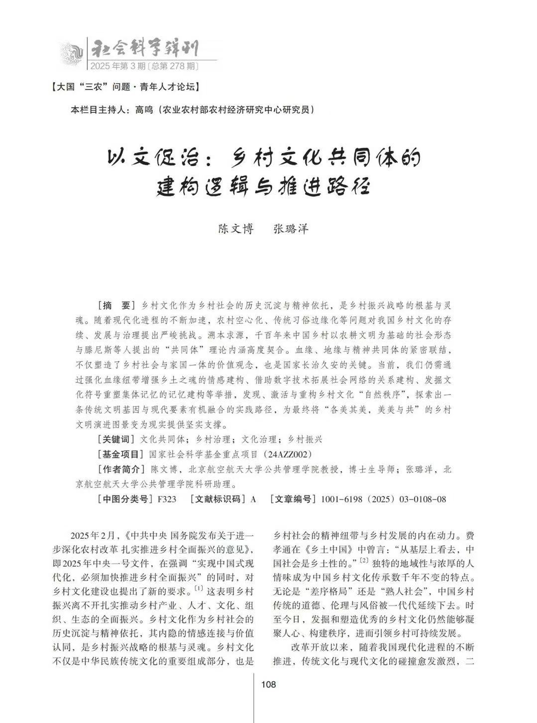 我院教授陳文博、科研助理張璐洋在《社會科學(xué)輯刊》發(fā)表文章:以文促治:鄉(xiāng)村文化共同體的建構(gòu)邏輯與推進(jìn)路徑